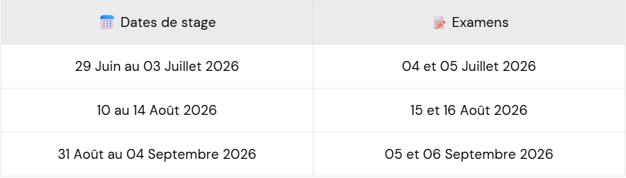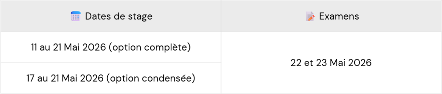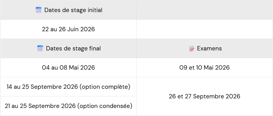 Ces stages sont encadrés par une équipe de formateurs expérimentés, dans un cadre structuré et conforme aux exigences fédérales, afin de maximiser vos chances de réussite à l’examen.